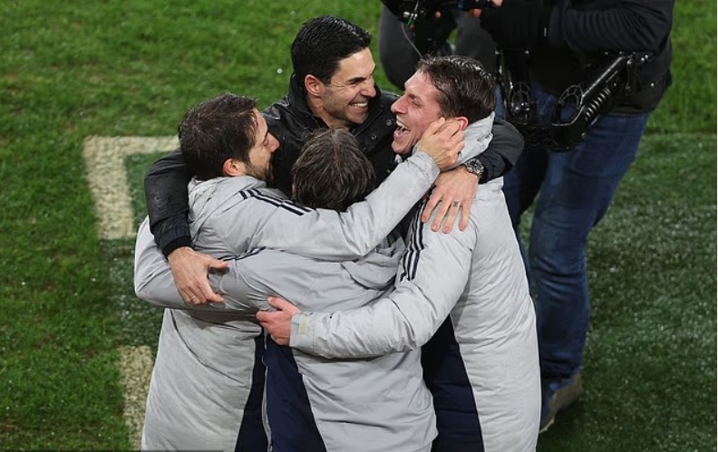 Mikel Arteta (top) and his backroom staff celebrate after reaching the Carabao Cup final
