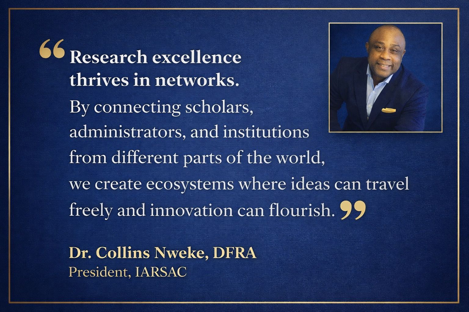 Collins Nweke DFRA, PhD (hc), a senior international trade consultant, policy commentator, Economic Diplomacy researcher, and author based in Belgium, has been appointed President of the International Association of Research Scholars & Administrators Corporation (IARSAC), Delaware, United States.