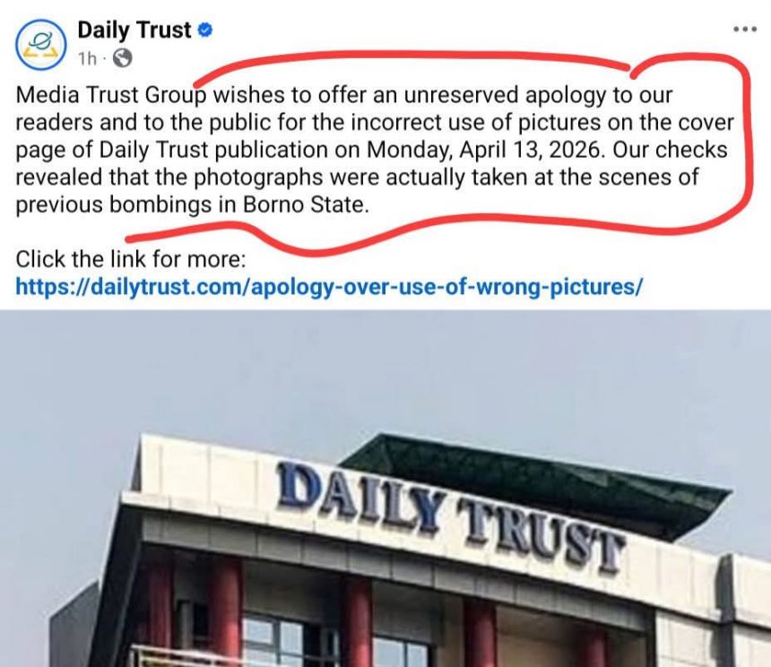 The Media Trust Group has issued an unreserved apology to readers and the general public over the publication of incorrect photographs on the front page of its flagship newspaper, Daily Trust, on Monday, April 13, 2026—marking yet another troubling lapse in editorial judgment.