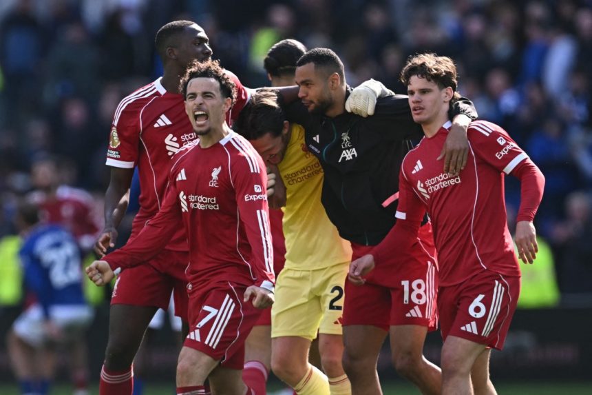Liverpool's English midfielder #17 Curtis Jones (L) and teammates celebrate on the pitch after the English Premier League football match between Everton and Liverpool at Hill Dickinson Stadium in Liverpool, north west England on April 19, 2026. Liverpool won the game 2-1. (Photo by Paul ELLIS / AFP) / RESTRICTED TO EDITORIAL USE. No use with unauthorized audio, video, data, fixture lists, club/league logos or 'live' services. Online in-match use limited to 120 images. An additional 40 images may be used in extra time. No video emulation. Social media in-match use limited to 120 images. An additional 40 images may be used in extra time. No use in betting publications, games or single club/league/player publications. /