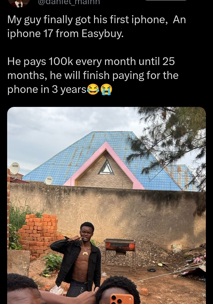 ”My guy finally got his first iphone, An iphone 17 from Easybuy.He pays 100k every month until 25 months, he will finish paying for the phone in 3 years😂😭”, The tweet reads.