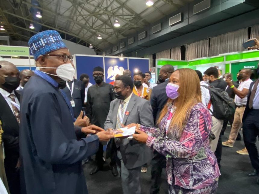 The Founder, H&Y Furniture Manufacturers, Mrs Feyisola Abiru, wife of the Distinguished Senator Mukhail Adetokunbo Abiru showed her company’s products to His Excellency, President Muhammadu Buhari at her stand at the AFREXIM Intra-African Trade Fair 2021 in Durban, South Africa on Monday.